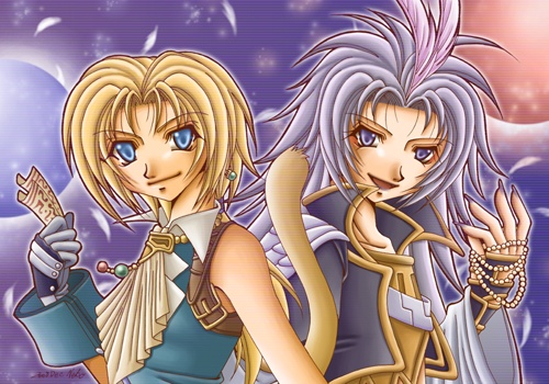 ジタンとクジャの不毛な戦い(笑)。二人がそれぞれのプレゼントを手にデートのお誘い中。プレゼントはジタンがお芝居のチケットでクジャが真珠のネックレス。本当はクジャはガーネット(1月の誕生石)の指輪が良かったんですが小さくて見えにくいかと思ってネックレスに・・・。 ディシディア版のジタンはFF9版よりもちょっとだけ大人っぽく描いてます。そして絵的に邪魔になると分かっていても無理矢理入れてしまうジタンのシッポ(笑)。 |