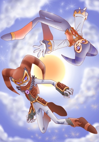 似てるからお互い気に入らないトカそんなの?顔合わせるたびにケンカとかそんなんだと良いかも。500戦250勝250敗トカ(笑)。 どの方向から見てもOKな上下左右のない絵です。オンマウスで配置が逆で日が暮れます。一日中飛んでんのか?とかつっこまないで(笑)。 リアラの赤とえんじ色の塗り分けが難しいのですよ。ナイツは袖と太ももの模様に苦労しました、結局縮小したらほとんど見えなくなったけど。 |
