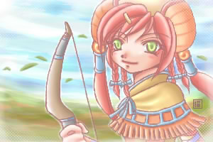 背景も描いてみましたが、中々ウソ臭い出来に(笑)。最初何も持っていなかったのですが空間が余ったので弓を持たせてみました。アイシャは弓が似合います。 いつか馬も一緒に描いてみたいものです。 |
