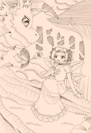 森を守る緑竜は花歌姫の綺麗な歌声を聴いて魔力を蓄える。 今日も小さな花をお土産に歌姫の歌を聴きにやってきました。 web拍手用に描いた絵です。楽器シリーズのつもりで描きましたが何かそれっぽくないので却下。 緑竜は耳が長くて身体が小さな竜のつもりで描きましたが、耳は切れてるわ歌姫が小さいので大きな竜に見えるわで、ちょっと無念(笑)。長い爪でちょこんと花を持つ仕草は気に入ってます。 歌姫ちゃんは葉っぱの羽と頭に生花が生えてます。こういう普通に美人系な女の子は私的には珍しいような気がしますね。 |