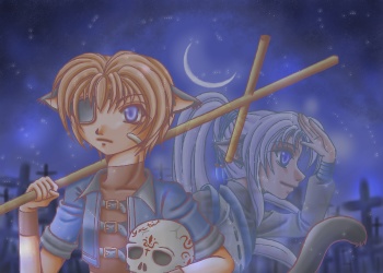 墓守の一族。 左の子が現在の墓守、右の子がそのご先祖様の幽霊。左の子が持ってるドクロは右の子のドクロ(笑)。一緒にお仕事中。右の子はもっとドクロから染み出てるような感じにすれば良かった・・・。どうも幽霊っぽさが足りない。 えらい時間かけてようやく描けたと思ったらサーバー障害で絵掲が吹っ飛んでてっきり消えたと思っていた絵。ちゃんとアニメーションまで保存してたようで、ファイル整理してたら出てきた。あまりの嬉しさに一枚絵としてアップ(笑)。 |