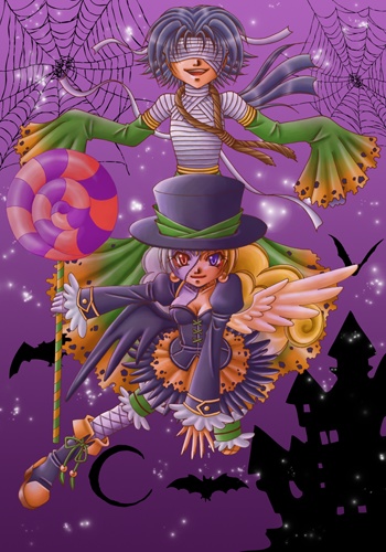 キャラの塗りが終わったのがハロウィンの2日前くらいで背景を描く時間がなくて背景はフリーのシェイプとPainterのブラシでやっつけちゃいました。その代わりと言っちゃ何ですがキャラの塗りは結構丁寧に出来た・・・んじゃないか・・・と・・・。