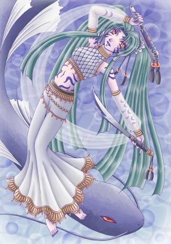 人魚ではないけれど何処となく「魚っぽい」お姐さんが描きたかったのですが、魚というよりは爬虫類っぽい感じに(笑)。目と肌の色の所為かな? 胸のウロコっぽいところを一生懸命塗ったのですがほとんど潰れて見えないのが残念です。 海の神は本当はナマズにしたかったのですが資料がない上に海にナマズはいねぇよ!ということで龍にするか蛇にするか悩んで結局ヒレとヒゲの付いた蛇という何だか中途半端な変生物になりました(笑)。 何気に守護獣と対っぽい色と構図になってます。 |