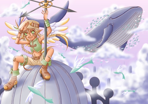 良い風の日にはクジラだって空を泳いでみたい 2008年暑中見舞いイラスト。 常日頃からキャラの顔が中心にならない構図に憧れつつ中々上手く描けなかったのですが今回はそこそこ?真っ先にクジラさんに目が行ってくれれば嬉しい。そんな実は主役のクジラさんですが実は資料ナシで描いちゃってたりします(笑)。多分口とヒレの位置がかなりデタラメかと。 かざみどり君は白地に黄色の飾り羽の付いた「黄芭旦(きばたん)」というオウムのイメージで描いてます。小さくて見えにくいですが髪はベージュ→黄色のグラデーションになってます。肌は褐色ではなくて日焼け。 |